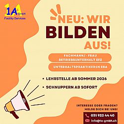 Wir bilden neu auch Lernende aus. Wir haben eine offene Lehrstelle ab dem 01.08.2026 für Fachmann/frau Betriebsunterhalt Hausdienst EFZ oder Unterhaltspraktiker*in EBA. Schnupperlehren sind jederzeit auf Anfrage möglich.